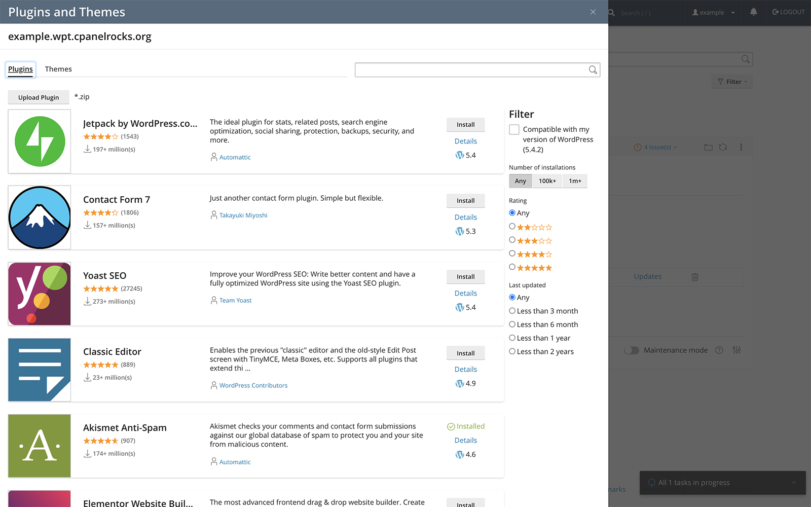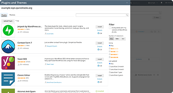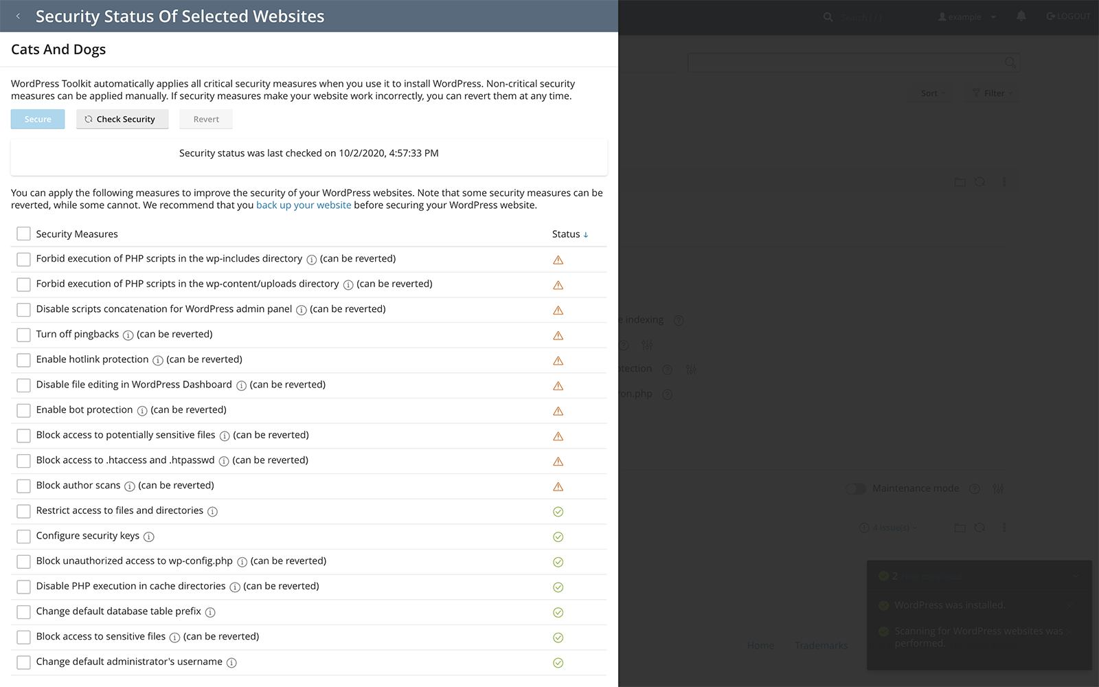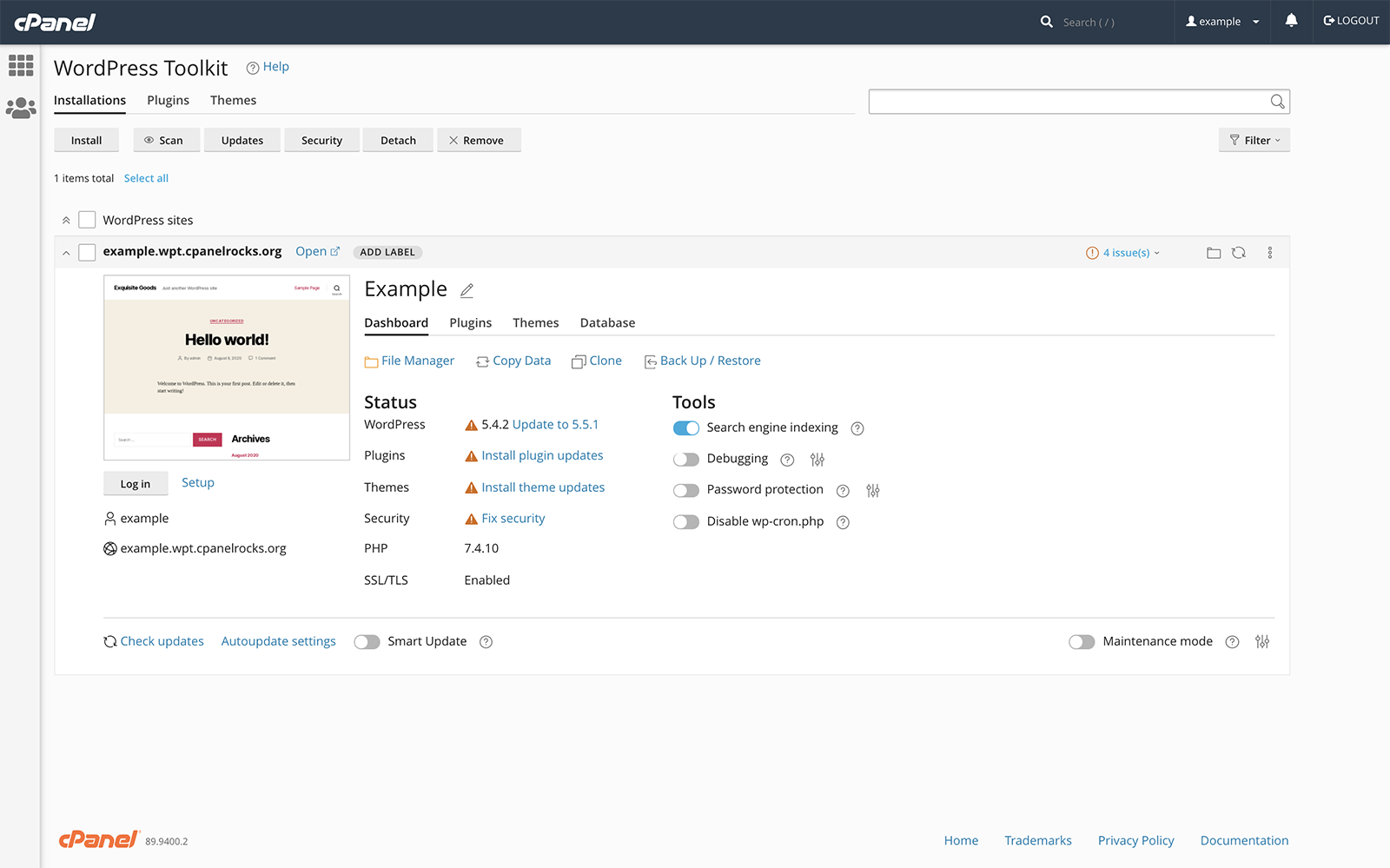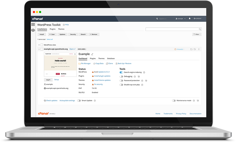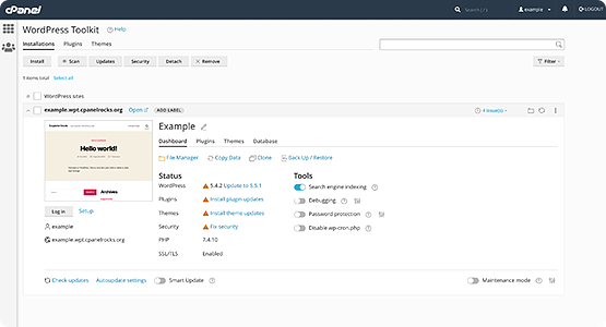 WP Toolkit Deluxe est une puissante extension pour WordPress qui inclut notamment la gestion des thèmes et des plug-ins, le renforcement de la sécurité, l'automatisation, le clonage et la sauvegarde/restauration. Le tout, à partir d'un seul tableau de bord convivial.